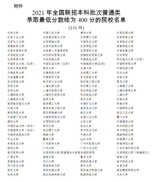 2021年全国联招本科批次普通类录取最低分数线为400分的院校名单: