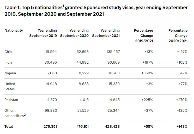日前,英国内政部发布了最新的《学生签证年度数据》。数据显示,在截至2021年9月的一年中,内政部共计发放了428,428份学生签证,创历史新高!同比2020年暴增143%,比疫情前的2019年高出55%。